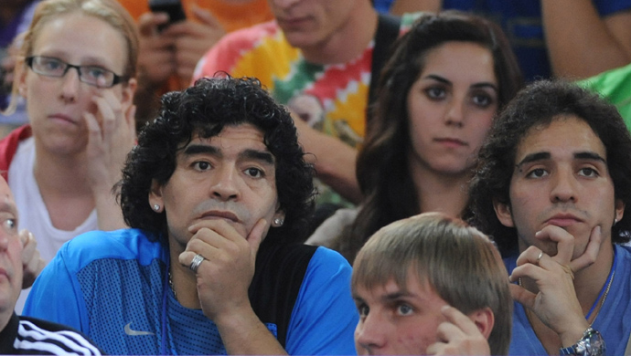 8月18日,阿根廷著名足球明星馬拉多納(左三)前來觀看阿根廷對俄羅斯的比賽。