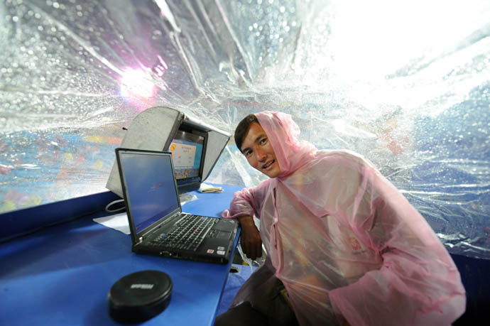 8月18日,新華社哈薩克族攝影記者沙達(dá)提在北京沙灘排球場(chǎng)內(nèi)與美聯(lián)社、法新社等多家媒體一起忙碌地處理圖片。