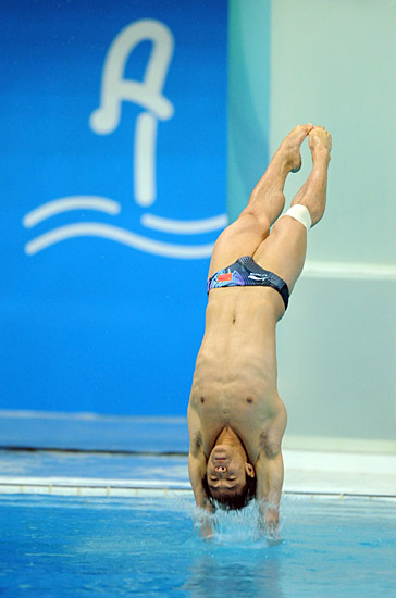 8月19日,中國選手何沖在比賽中。當日,北京奧運會跳水比賽在國家游泳中心——“水立方”繼續(xù)進行,何沖在男子3米跳板決賽中獲得冠軍。