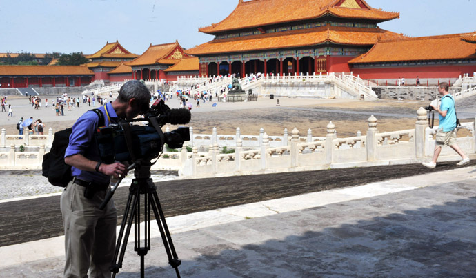 8月19日,一位來自美國的電視記者在故宮采訪拍攝。北京奧運會期間,眾多外國游客來到北京故宮參觀游覽,了解和感受中國文化。