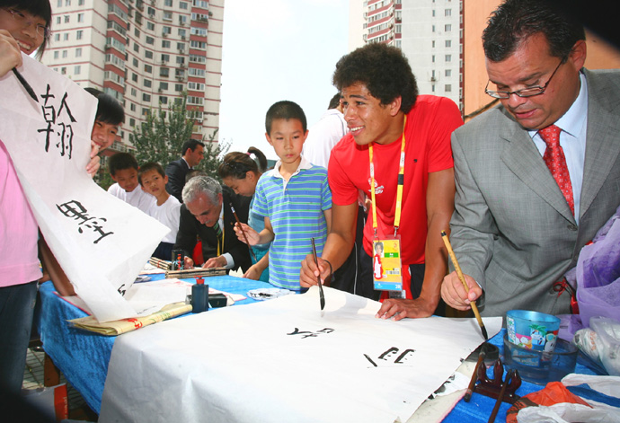 8月19日,智利運(yùn)動(dòng)員埃利奧特(右二)在學(xué)寫(xiě)毛筆字。當(dāng)日,幾位參加北京奧運(yùn)會(huì)的智利客人來(lái)到“同心結(jié)”學(xué)校——西羅園五小參觀,向孩子們學(xué)習(xí)剪紙、捏面人和書(shū)法等中國(guó)傳統(tǒng)藝術(shù)。