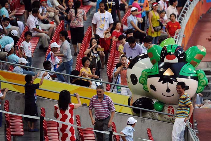8月19日,熱情的觀眾紛紛與福娃合影留念。北京奧運(yùn)會(huì)田徑比賽在國(guó)家體育場(chǎng)漸入高潮,前來(lái)“鳥巢”觀賽的觀眾們更是熱情高漲。