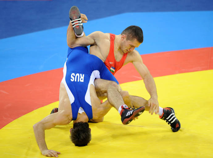 8月20日,在北京奧運會摔跤男子自由式74公斤級決賽中,俄羅斯選手布瓦伊薩·薩伊季耶夫(藍)戰(zhàn)勝烏茲別克斯坦選手索斯蘭·季基耶夫,獲得冠軍。