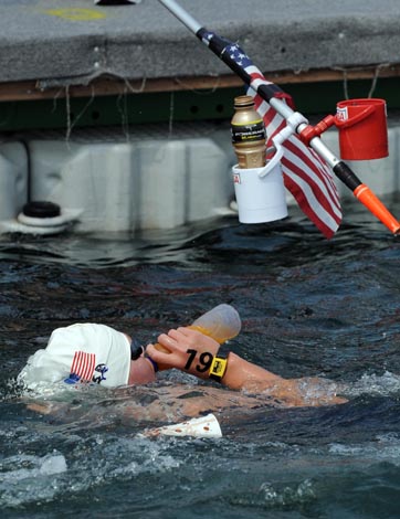美國選手克洛艾·薩頓在女子10公里馬拉松游泳比賽中補(bǔ)充能量。