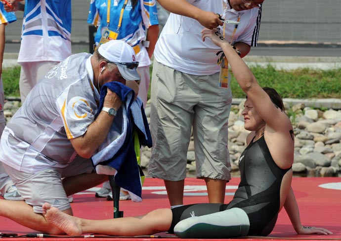 獲得女子10公里馬拉松游泳第16名的南非殘疾人選手納塔莉·杜托伊特(右)在比賽結(jié)束后休息。杜托伊特原是一位游泳健將,2001年2月,她在一次摩托車事故中失去了左小腿。此后,杜托伊特克服困難繼續(xù)苦練游泳,在雅典殘奧會上獲得5枚金牌。納塔莉·杜托伊特還是惟一取得參加北京奧運(yùn)會和北京殘奧會兩個運(yùn)動會的選手。