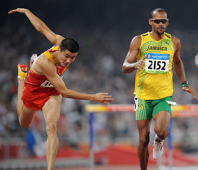 8月20日,中國(guó)選手史冬鵬(左)在男子110米欄半決賽中。史冬鵬名列小組第五名,無(wú)緣決賽。當(dāng)日,北京奧運(yùn)會(huì)田徑比賽在國(guó)家體育場(chǎng)“鳥(niǎo)巢”繼續(xù)進(jìn)行。