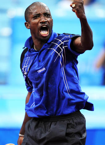 8月20日,尼日利亞選手塞貢·托里奧拉在比賽中歡呼。當(dāng)日,托里奧拉在北京奧運會乒乓球男子單打第二輪中以4比2戰(zhàn)勝比利時名將大塞弗,晉級下一輪。