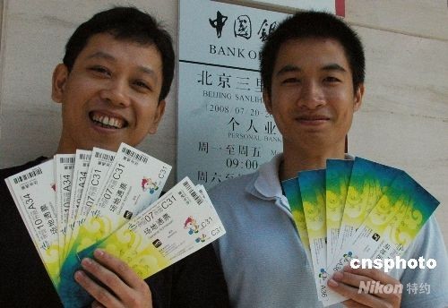 8月15日,2008年北京殘奧會體育比賽門票在北京地區(qū)的30個中國銀行門票代售網(wǎng)點(diǎn)銷售,并提供現(xiàn)場打印門票服務(wù)。公眾持有效身份證件在代售網(wǎng)點(diǎn)排隊(duì)實(shí)時購票,每人每次最多買2個場次共10張門票。目前共有205個比賽場次80萬張比賽門票供銷售,購票時間截至到9月17日。圖為來自廣東的民眾高興地買到殘奧會門票。