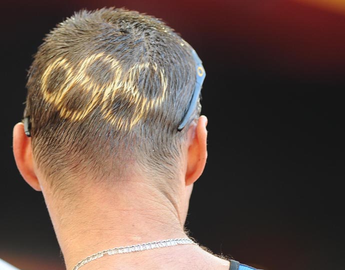 8月22日,北京奧運(yùn)會(huì)男子50公里競(jìng)走比賽在國(guó)家體育場(chǎng)“鳥巢”結(jié)束。圖為斯洛伐克選手卡濟(jì)米爾·韋爾金頭上的“五環(huán)”。