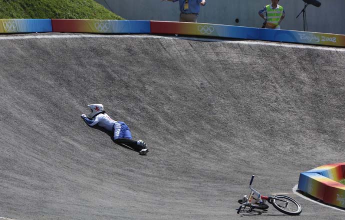 8月22日,英國選手莎娜茲·里德在小輪車女子競速決賽中摔倒。當日,里德在北京奧運會自行車小輪車女子競速決賽中本來一直處于領先位置,但在最后一個彎道不慎摔倒,與金牌擦肩而過。