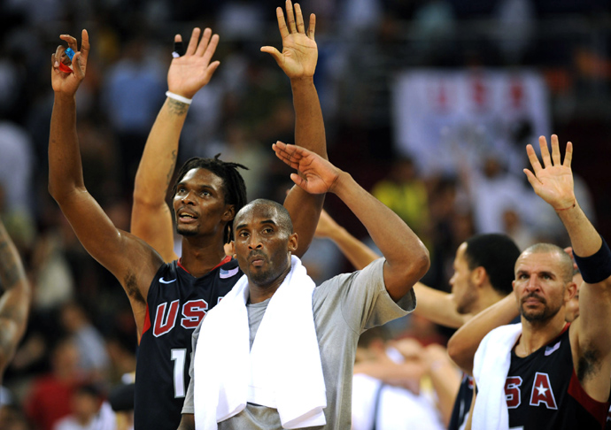 8月22日,美國隊球員科比(中)與隊友在比賽后向觀眾致意。當(dāng)日,在北京奧運會男籃半決賽中,美國隊以101比81戰(zhàn)勝阿根廷隊,挺進決賽。