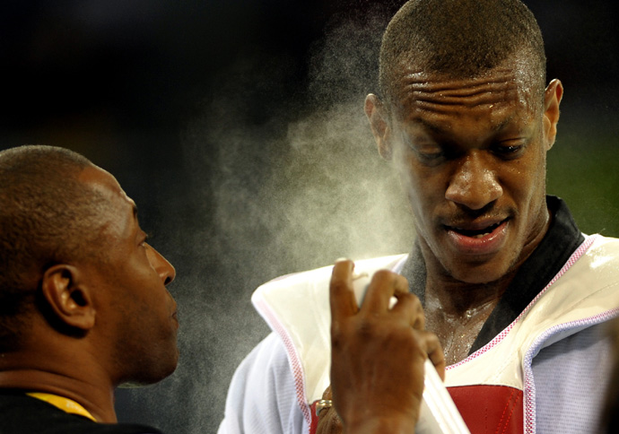 8月23日,馬里選手凱塔的教練在奧運(yùn)會(huì)跆拳道男子80公斤以上級(jí)四分之一決賽間隙,給他噴“霧”降溫。