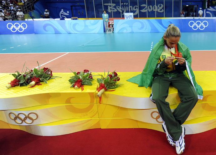 8月23日,巴西隊隊員奧利韋拉一人獨坐領(lǐng)獎臺,端詳金牌。當(dāng)日,在北京奧運會女排決賽中,巴西隊以3比1戰(zhàn)勝美國隊,獲得冠軍。