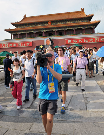 8月23日,一名外國攝像師在天安門城樓前拍攝。隨著北京奧運會即將結(jié)束,大批外國人來到天安門廣場參觀游覽。