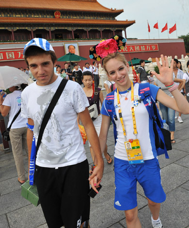 8月23日,兩位外國游客在天安門城樓前游覽。隨著北京奧運(yùn)會即將結(jié)束,大批外國人來到天安門廣場參觀游覽。