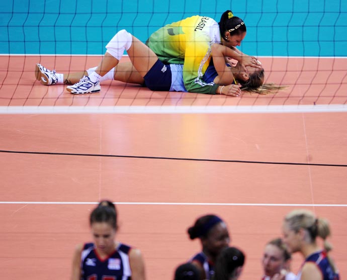 8月23日,巴西隊(duì)員(上)在比賽后慶祝。當(dāng)日,在北京奧運(yùn)會(huì)女排決賽中,巴西隊(duì)以3比1戰(zhàn)勝美國(guó)隊(duì),獲得冠軍。