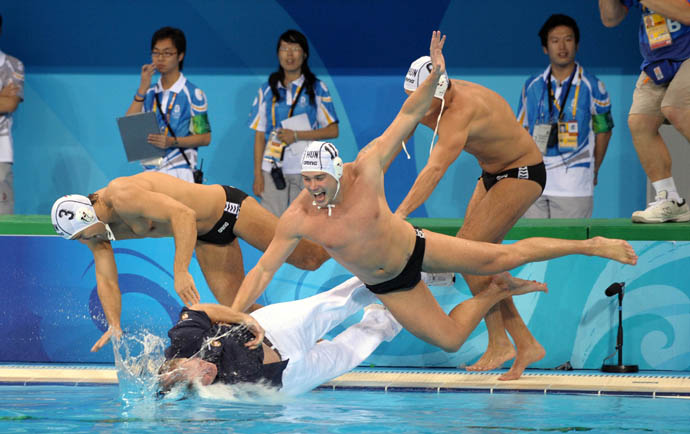 在水球男子決賽中,匈牙利隊(duì)以14比10戰(zhàn)勝美國(guó)隊(duì),獲得冠軍。