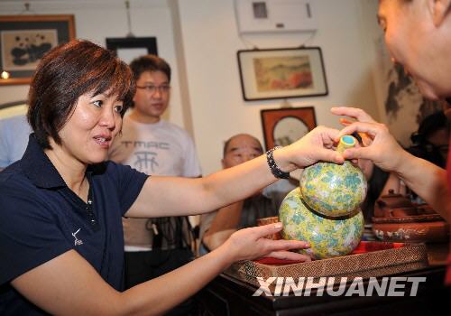 8月28日,美國女排主教練郎平(左)在古玩城查看瓷器。