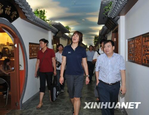 8月28日,美國女排主教練郎平(中)在古玩城內游覽。