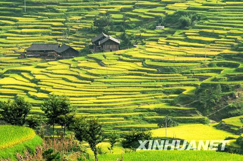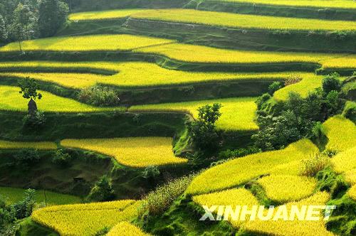 9月7日拍攝的都勻市基場水族鄉(xiāng)稻谷豐收的景象。貴州省都勻市基場水族鄉(xiāng)今年風(fēng)調(diào)雨順,稻谷長勢喜人,隨著金秋時節(jié)的到來,梯田里的稻谷已開始成熟,呈現(xiàn)出一派豐收的美麗景象。