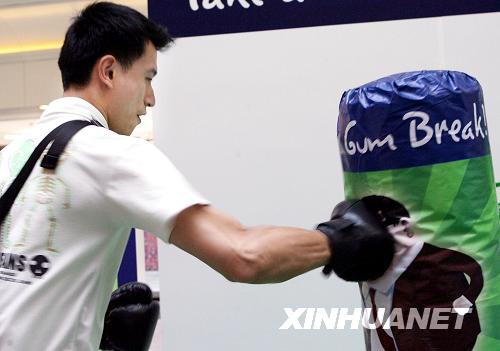 9月16日,一名白領(lǐng)在“減壓房”擊打沙袋進(jìn)行“減壓”。