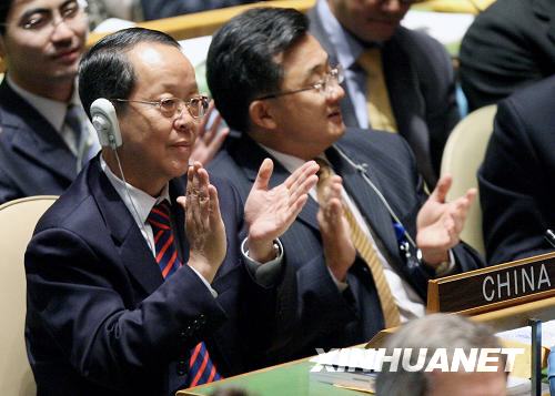 9月16日,在美國紐約聯(lián)合國總部,中國常駐聯(lián)合國代表王光亞(前左)在第63屆聯(lián)大第一次全會上鼓掌。
