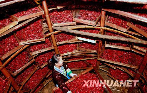 9月24日,在廣西融水苗族自治縣桿洞鄉(xiāng)花孖苗寨,寨里辣椒合作社的一位社員在辣椒烤房里準(zhǔn)備烘烤辣椒。