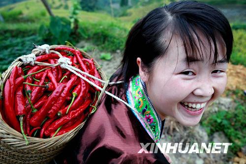 9月24日,在廣西融水苗族自治縣桿洞鄉(xiāng)花孖苗寨,寨里辣椒合作社的一位苗家女背著剛采摘的辣椒回家。 | |