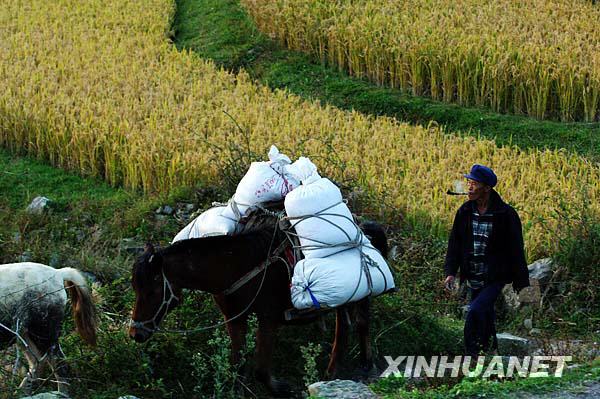 10月7日傍晚,貴陽(yáng)市花溪區(qū)高坡鄉(xiāng)大洪村農(nóng)民運(yùn)送剛收割的稻谷回家。眼下貴陽(yáng)已進(jìn)入秋糧收割高峰期,農(nóng)民們正利用好天氣加緊搶收稻谷,顆粒歸倉(cāng)。 |