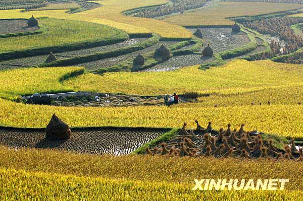 10月7日在貴陽(yáng)市花溪區(qū)高坡鄉(xiāng)拍攝的稻田。眼下貴陽(yáng)已進(jìn)入秋糧收割高峰期,農(nóng)民們正利用好天氣加緊搶收稻谷,顆粒歸倉(cāng)。 | |