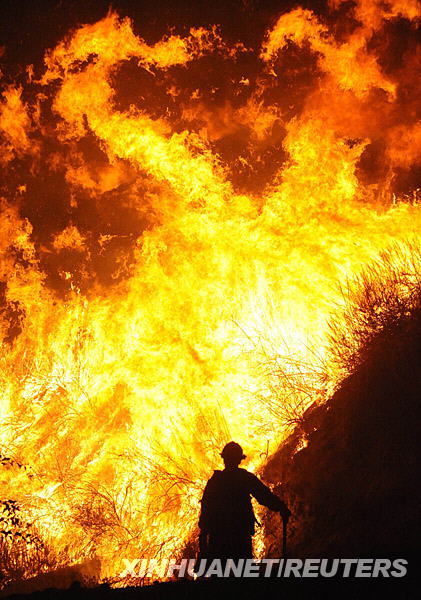 10月12日,在美國(guó)洛杉磯市區(qū)以北約20公里的峽谷地區(qū),消防員在準(zhǔn)備滅火。時(shí)速達(dá)每小時(shí)50英里的陣風(fēng)導(dǎo)致這場(chǎng)森林火災(zāi)不斷蔓延,威脅到附近的農(nóng)場(chǎng)和房屋。新華社/路透