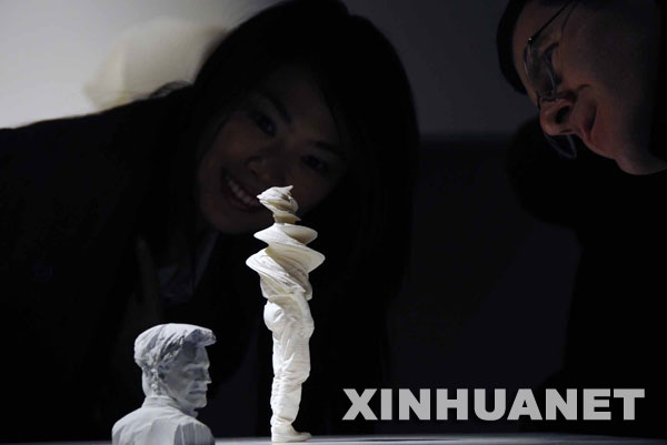 2008年10月9日,參觀者在觀看兩件數(shù)碼石雕作品。