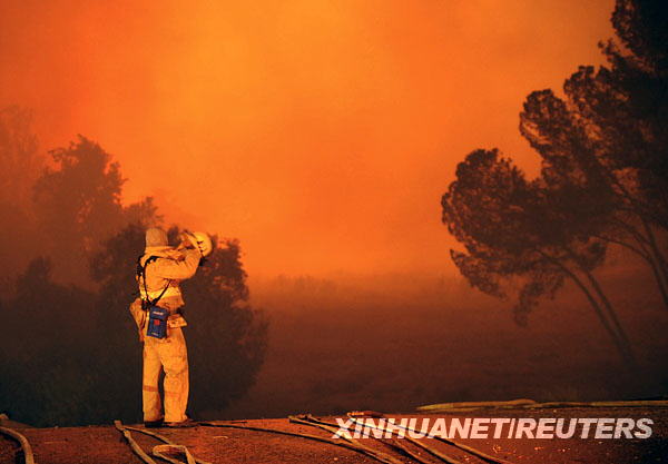10月14日,在美國(guó)加利福尼亞州洛杉磯市以北的格拉納達(dá)山,一名消防員做滅火前的準(zhǔn)備工作。