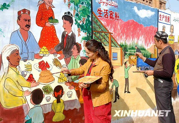 10月27日,兩名繪畫愛好者在吐魯番市亞爾鄉(xiāng)東門村繪制“文化墻”。