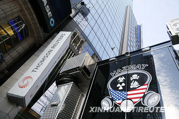 10月27日,一輛危險物品處置車停在美國紐約路透社編輯部外。路透社在紐約的編輯部當天收到裝有白色粉末的信件,全部人員隨后撤離辦公室。 新華社/路透