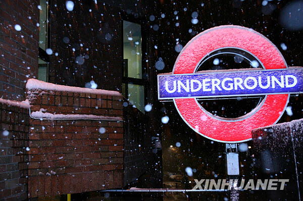 10月28日夜,英國首都倫敦一個地鐵標(biāo)志牌被雪覆蓋。