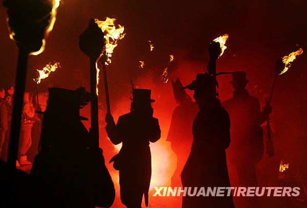 11月5日,人們?cè)谟?guó)南部的劉易斯市舉著火把游行。當(dāng)天是英國(guó)一年一度的焰火慶典節(jié)日,人們點(diǎn)起篝火,燃放煙花慶祝這一節(jié)日。新華社/路透