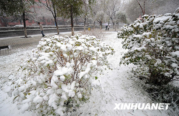 11月9日,白雪覆蓋著烏魯木齊市街頭植被。