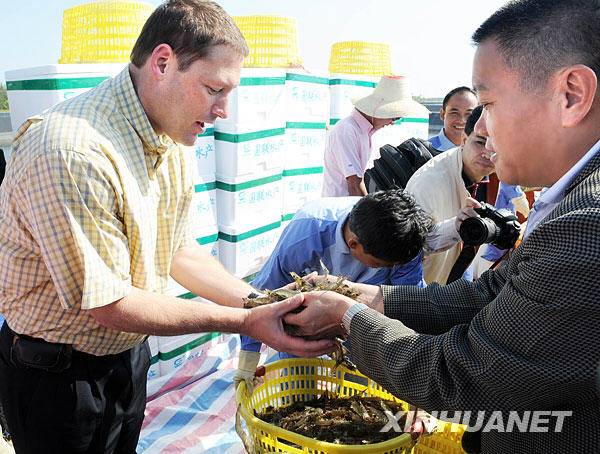 11月10日,美國沃爾瑪集團(tuán)副總裁查理斯·雷德菲爾德(左)仔細(xì)觀看國聯(lián)水產(chǎn)公司的水產(chǎn)品。