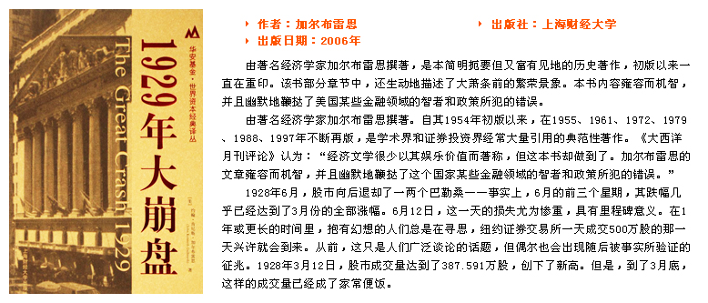 由著名經濟學家加爾布雷思撰著,是本簡明扼要但又富有見地的歷史著作,初版以來一直在重印。該書部分章節(jié)中,還生動地描述了大蕭條前的繁榮景象。本書內容雍容而機智,并且幽默地鞭撻了美國某些金融領域的智者和政策所犯的錯誤。