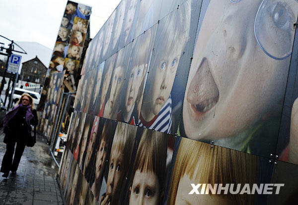 11月16日,在冰島首都雷克雅未克,一名女子從一面張貼著數(shù)百張兒童肖像照片的墻壁旁走過。