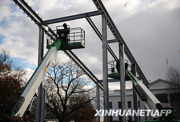 11月18日,在美國首都華盛頓白宮前,工人們在搭建總統(tǒng)就職儀式使用的臺子,F(xiàn)年47歲的奧巴馬11月4日當(dāng)選美國第44任總統(tǒng),他將于明年1月20日正式就職。新華社/法新