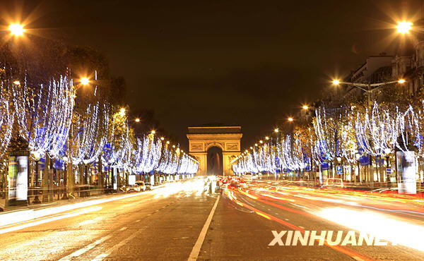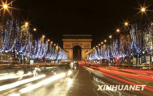 11月19日晚,圣誕彩燈照亮法國(guó)巴黎的香榭麗舍大街。