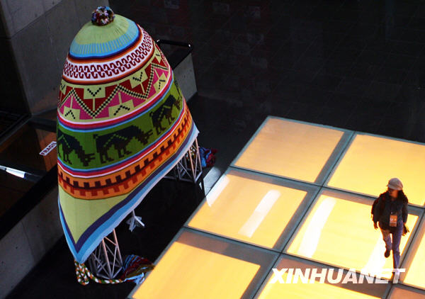 11月19日,在秘魯首都利馬國家博物館,一名采訪APEC部長級會議的記者從一頂高6.5米、寬3.5米的“秋搖”遮耳帽旁走過。