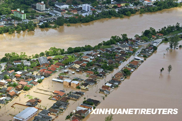 11月24日,巴西圣卡塔琳娜州伊爾霍塔的大片房屋被洪水淹沒。連日暴雨在巴西南部引發(fā)洪災(zāi),造成至少59人死亡,4萬多人被迫撤離,圣卡塔琳娜州宣布進入緊急狀態(tài)。新華社/路透