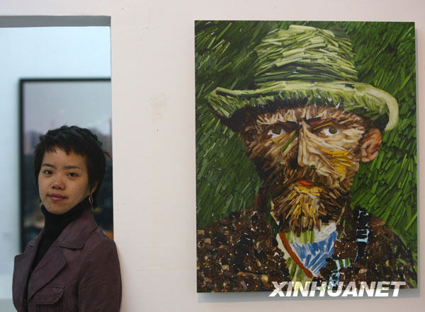 11月26日,桔多淇和她的作品合影!笆卟瞬┪镳^”攝影展日前在北京開展,年輕藝術(shù)家桔多淇用糧食、蔬菜等食物拼貼成世界名畫,并拍攝成照片,其中包括《蒙娜麗莎》、《瑪麗蓮·夢(mèng)露》和畢加索的《夢(mèng)》等作品。