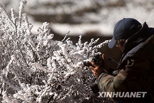 一位攝影愛好者在拉薩市墨竹工卡縣“日多”溫泉附近山林拍攝霧凇景觀(11月29日攝)。近日,西藏拉薩市墨竹工卡縣“日多”溫泉附近山林出現(xiàn)霧凇景觀,整片山林呈現(xiàn)出玉樹瓊枝的美麗景象。