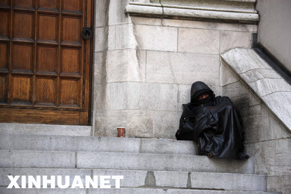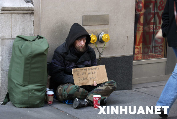 12月5日,美國勞工部公布的數(shù)據(jù)顯示,今年11月份美國非農(nóng)業(yè)部門就業(yè)崗位減少53.3萬個(gè),為1974年12月份以來的最大減幅,失業(yè)率上升到6.7%,為15年來的最高點(diǎn)。這是11月11日,一名流浪漢在美國紐約曼哈頓街頭乞討。 |
