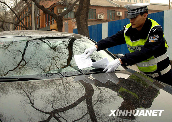 12月10日,北京東城交警支隊的干警在亂停放的車輛上擺放提示單。近日,北京開始集中整治亂停車,把城區(qū)主要大街、環(huán)線道路、交通樞紐地區(qū)、繁華商業(yè)網(wǎng)點以及遠郊區(qū)縣的中心城區(qū)道路等處作為重點整治地段,以緩解因違法停車而導致的交通擁堵。