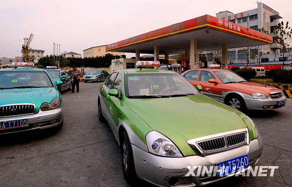 幾輛出租車在杭州一處加油站外等待加油(12月13日攝)。近日,杭州市委、市政府公布包括補貼、減稅等在內(nèi)的13條舉措,促進出租車行業(yè)健康穩(wěn)定發(fā)展,為出租車司機減負。
